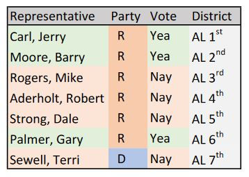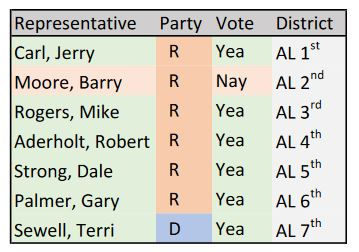 In the US House final vote, Rep Barry Moore was the lone No vote among Alabama US House members.